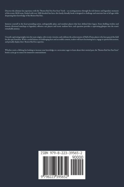 Discover the ultimate fan experience with the "Boston Red Sox Fun Facts" book – an exciting journey through the rich history and legendary moments of this iconic MLB team. Packed with over 1000 detailed fun facts, this family-friendly book is designed to challenge and entertain fans of all ages while deepening their knowledge of the Boston Red Sox. Immerse yourself in the heart-pounding action, unforgettable plays, and standout players that have defined their legacy. From thrilling rivalries and historic divisional matchups to legendary offensive star players and iconic stadium facts, each question provides a captivating glimpse into the team's remarkable journey. Unearth captivating insights into the team origins, relive iconic victories, and celebrate the achievements of Hall of Fame players who have graced the field for this epic franchise. With a careful balance of challenging facts and accessible content, readers will learn fascinating facts, engage in spirited discussions, and proudly display their Boston Red Sox expertise. Whether you're a lifelong fan looking to increase your knowledge or a newcomer eager to learn about their storied past, the "Boston Red Sox Fun Facts" book is your go-to source for immersive entertainment.