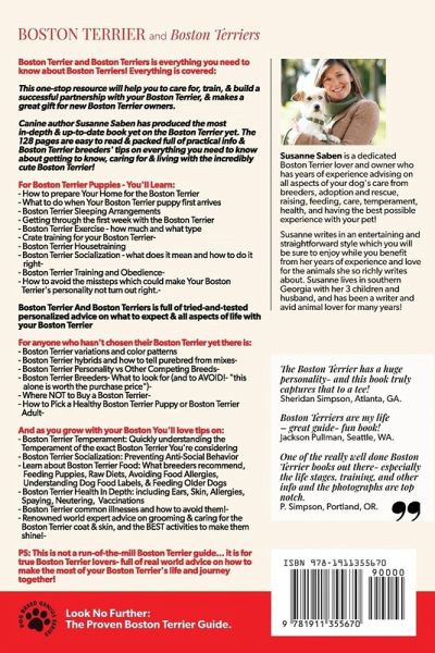 BOSTON TERRIER AND BOSTON TERRIERS is your definitive Boston Terrier Guide! Everything is covered: from Boston Terrier Puppies, Boston Terrier Breeders, Boston Terrier Grooming, Boston Terrier Training, bringing your Boston Terrier home, Boston Terrier Dogs as Adults, Boston Terrier Health & Nutrition, Boston Terrier Temperament, and all the proven INSIDER TIPS you’ll need to have the very best experience with your Boston Terrier! This one-stop resource will help you to care for, train, & build a successful partnership with your Boston Terrier, & makes a great gift for new owners. Canine author Susanne Saben has produced the most in-depth & up-to-date book yet on the Boston Terrier. The 128 pages are easy to read & packed full of practical info & breeders' tips on everything you need to know about getting to know, caring for & living with the magnificent Boston Terrier! Everything is Covered – including: Boston Terrier Puppies – You’ll Learn: How to prepare Your Home & yard What to do when Your puppy first arrives Boston Terrier Sleeping Arrangements Getting through the first week Exercise – how much and what type Crate training for your Boston Terrier Housetraining Socialization – what does it mean and how to do it right Training & Obedience How to avoid the missteps which could make Your Boston Terrier’s personality not turn out right. Boston Terrier And Boston Terriers is full of tried-and-tested personalized advice on what to expect & all aspects of life with your Boston Terrier, from bringing home your puppy through adolescence and into a thriving adulthood. For anyone who hasn’t chosen their Boston Terrier yet there is: Boston Terrier variations and color patterns. Boston Terrier hybrids and how to tell purebred from mixes The Personality of the Boston Terrier vs Other Competing Breeds Boston Terrier Breeders- What to look for (and to AVOID!). Where NOT to Buy a Boston Terrier How to Pick a Healthy Boston Terrier Puppy or Boston Terrier Adult Boston Terrier Socialization Preventing Anti-Social Behavior Learn about Boston Terrier Food-What breeders recommend, Feeding Puppies, Raw Diets, Avoiding Food Allergies, Understanding Dog Food Labels, & Feeding Older Dogs. In Depth- Boston Terrier Health: including Ears, Skin, Allergies, Spaying, Neutering, Vaccinations, Preventing Fleas & Microchipping, Boston Terrier common illnesses and how to avoid them! Renowned world expert advice on the Boston Terrier including grooming & caring for the Boston Terrier coat & skin, and the BEST activities to make them shine! PS: This is not a run-of-the-mill book… it is for true Boston Terrier lovers- full of real world advice on how to make the most of your Boston Terrier’s life and journey together! "The Boston Terrier has a huge personality- and this book truly captures that to a tee!" Sheridan Simpson, Atlanta, GA. "Boston Terriers are my life – great guide- fun book!" Jackson Pullman, Seattle, WA. "One of the really well done Boston Terrier books out there- especially the life stages, training, and other info and the photographs are top notch." P. Simpson, Portland, OR.