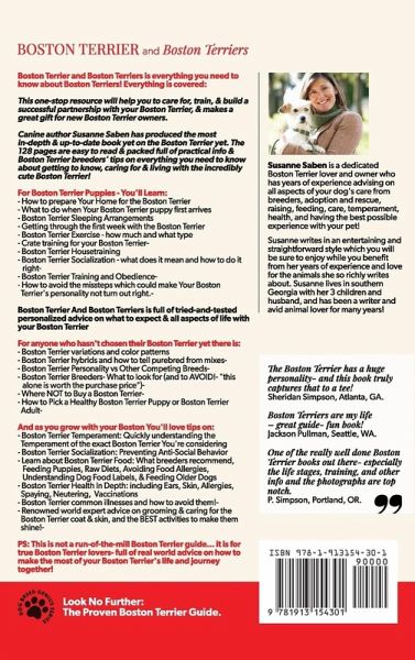 BOSTON TERRIER AND BOSTON TERRIERS is everything you need to know about Boston Terriers! Everything is covered: -This one-stop resource will help you to care for, train, & build a successful partnership with your Boston Terrier, & makes a great gift for new Boston Terrier owners.- -Canine author Susanne Saben has produced the most in-depth & up-to-date book yet on the Boston Terrier yet. The 130 pages are easy to read & packed full of practical info & Boston Terrier breeders' tips on everything you need to know about getting to know, caring for & living with the incredibly cute Boston Terrier! For Boston Terrier Puppies - You'll Learn:- -How to prepare Your Home for the Boston Terrier- -What to do when Your Boston Terrier puppy first arrives- -Boston Terrier Sleeping Arrangements- -Getting through the first week with the Boston Terrier- -Boston Terrier Exercise - how much and what type -Crate training for your Boston Terrier- -Boston Terrier Housetraining- -Boston Terrier Socialization - what does it mean and how to do it right- -Boston Terrier Training and Obedience- -How to avoid the missteps which could make Your Boston Terrier's personality not turn out right.- -Boston Terrier And Boston Terriers is full of tried-and-tested personalized advice on what to expect & all aspects of life with your Boston Terrier- For anyone who hasn't chosen their Boston Terrier yet there is:- -Boston Terrier variations and color patterns.- -Boston Terrier hybrids and how to tell purebred from mixes- -Boston Terrier Personality vs Other Competing Breeds- -Boston Terrier Breeders- What to look for (and to AVOID!- "this alone is worth the purchase price")- -Where NOT to Buy a Boston Terrier- -How to Pick a Healthy Boston Terrier Puppy or Boston Terrier Adult- -Boston Terrier Temperament: Quickly understanding the Temperament of the exact Boston Terrier You're considering- -Boston Terrier Socialization: Preventing Anti-Social Behavior- -Learn about Boston Terrier Food- What breeders recommend, Feeding Puppies, Raw Diets, Avoiding Food Allergies, Understanding Dog Food Labels, & Feeding Older Dogs.- -Boston Terrier Health In Depth-: including Ears, Skin, Allergies, Spaying, Neutering, Vaccinations- -Boston Terrier common illnesses and how to avoid them!- -Renowned world expert advice on grooming & caring for the Bos to get Yours Now!- So what are You waiting for? Click the Buy Now button on the Top Right of This Page- to get Yours Now "The Boston Terrier has a huge personality- and this book truly captures that to a tee!" Sheridan Simpson, Atlanta, GA. "Boston Terriers are my life - great guide- fun book!" Jackson Pullman, Seattle, WA. ¿"One of the really well done Boston Terrier books out there- especially the life stages, training, and other info and the photographs are top notch." P. Simpson, Portland, OR.