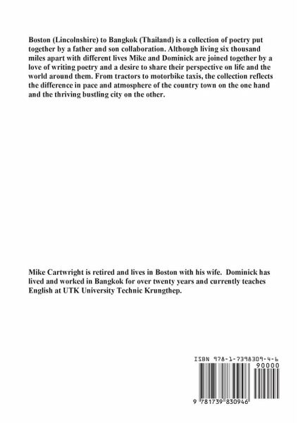 Boston (Lincolnshire) to Bangkok (Thailand) is a collection of poetry put together by a father and son collaboration. Although living six thousand miles apart with different lives Mike and Dominick are joined together by a love of writing poetry and a desire to share their perspective on life and the world around them. From tractors to motorbike taxis, the collection reflects the difference in pace and atmosphere of the country town and the thriving bustling city on the other.