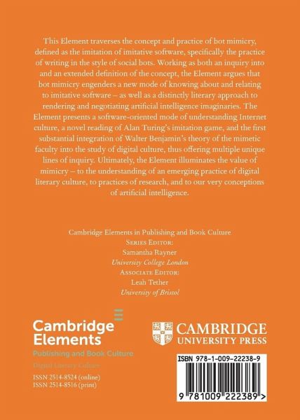 This Element traverses the concept and practice of bot mimicry, defined as the imitation of imitative software, specifically the practice of writing in the style of social bots. It argues that bot mimicry engenders a new mode of knowing about and relating to imitative software.