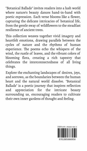 "Botanical Ballads" invites readers into a lush world where nature's beauty dances hand-in-hand with poetic expression. Each verse blooms like a flower, capturing the delicate intricacies of botanical life, from the gentle sway of wildflowers to the steadfast resilience of ancient trees. This collection weaves together vivid imagery and heartfelt emotions, drawing parallels between the cycles of nature and the rhythms of human experience. The poems echo the whispers of the wind, the rustle of leaves, and the vibrant colors of blooming flora, creating a rich tapestry that celebrates the interconnectedness of all living things. Explore the enchanting landscapes of desires, joys, and sorrows, as the boundaries between the human heart and the natural world dissolve. "Botanical Ballads" is a poetic journey that inspires reflection and appreciation for the intricate beauty surrounding us, encouraging readers to cultivate their own inner gardens of thought and feeling.