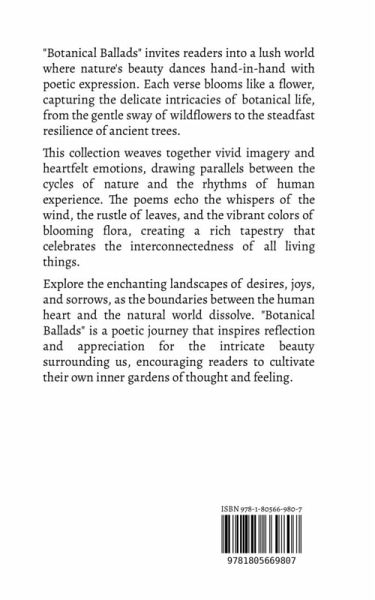 "Botanical Ballads" invites readers into a lush world where nature's beauty dances hand-in-hand with poetic expression. Each verse blooms like a flower, capturing the delicate intricacies of botanical life, from the gentle sway of wildflowers to the steadfast resilience of ancient trees. This collection weaves together vivid imagery and heartfelt emotions, drawing parallels between the cycles of nature and the rhythms of human experience. The poems echo the whispers of the wind, the rustle of leaves, and the vibrant colors of blooming flora, creating a rich tapestry that celebrates the interconnectedness of all living things. Explore the enchanting landscapes of desires, joys, and sorrows, as the boundaries between the human heart and the natural world dissolve. "Botanical Ballads" is a poetic journey that inspires reflection and appreciation for the intricate beauty surrounding us, encouraging readers to cultivate their own inner gardens of thought and feeling.