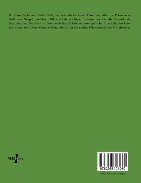 Dr. Hans Bachmann (1866 - 1940) verfasste dieses kleine Handbuch über die Pflanzen im Golf von Neapel, welches 1904 erstmals erschien, insbesondere für die Freunde der Naturstudien. Das Buch ist denn auch für die Interessierten gedacht. In auf für den Laien leicht verständlichen Worten erläutert der Autor die marine Pflanzenwelt des Mittelmeeres.