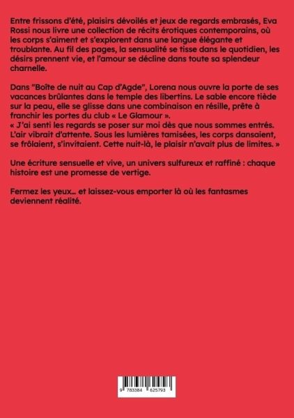 Entre frissons d'été, plaisirs dévoilés et jeux de regards embrasés, Eva Rossi nous livre une collection de récits érotiques contemporains, où les corps s'aiment et s'explorent dans une langue élégante et troublante. Au fil des pages, la sensualité se tisse dans le quotidien, les désirs prennent vie, et l'amour se décline dans toute sa splendeur charnelle.Dans "Boîte de nuit au Cap d'Agde", Lorena nous ouvre la porte de ses vacances brûlantes dans le temple des libertins. Le sable encore tiède sur la peau, elle se glisse dans une combinaison en résille, prête à franchir les portes du club « Le Glamour ».« J'ai senti les regards se poser sur moi dès que nous sommes entrés. L'air vibrait d'attente. Sous les lumières tamisées, les corps dansaient, se frôlaient, s'invitaient. Cette nuit-là, le plaisir n'avait plus de limites. »Une écriture sensuelle et vive, un univers sulfureux et raffiné : chaque histoire est une promesse de vertige.Fermez les yeux... et laissez-vous emporter là oùles fantasmes deviennent réalité.
