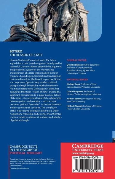 Niccolò Machiavelli's seminal work, The Prince, argued that a ruler could not govern morally and be successful. Giovanni Botero disputed this argument and proposed a system for the maintenance and expansion of a state that remained moral in character. Founding an anti-Machiavellian tradition that aimed to refute Machiavelli in practice, Botero is an important figure in early modern political thought, though he remains relatively unknown. His most notable work, Della ragion di Stato, first popularised the term 'reason of state' and made a significant contribution to a major political debate of the time - the perennial issue of the relationship between politics and morality - and the book became a political 'bestseller' in the late sixteenth and the seventeenth century. This translation of the 1589 volume introduces Botero to a wider Anglophone readership and extends this influential text to a modern audience of students and scholars of political thought.