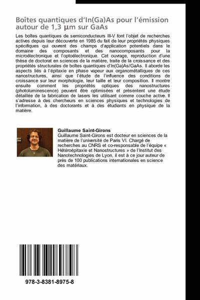 Les boîtes quantiques de semiconducteurs III-V font l objet de recherches actives depuis leur découverte en 1985 du fait de leur propriétés physiques spécifiques qui ouvrent des champs d application potentiels dans le domaine des composants et des nanocomposants pour la microélectronique et l optoélectronique. Cet ouvrage, reproduction d une thèse de doctorat en sciences de la matière, traite de la croissance et des propriétés structurales de boîtes quantiques d In(Ga)As/GaAs. Il aborde les aspects liés à l épitaxie en phase vapeur aux organométalliques de ces nanostructures, ainsi que l étude de l influence des conditions de croissance sur leur morphologie, leur taille et leur composition. Il montre ensuite comment les propriétés optiques des nanostructures (photoluminescence) peuvent être optimisées et présentent une étude détaillée de la fabrication de lasers les utilisant comme couche active. Il s adresse à des chercheurs en sciences physiques et technologies de l information, à des doctorants et à des étudiants en physique de la matière.