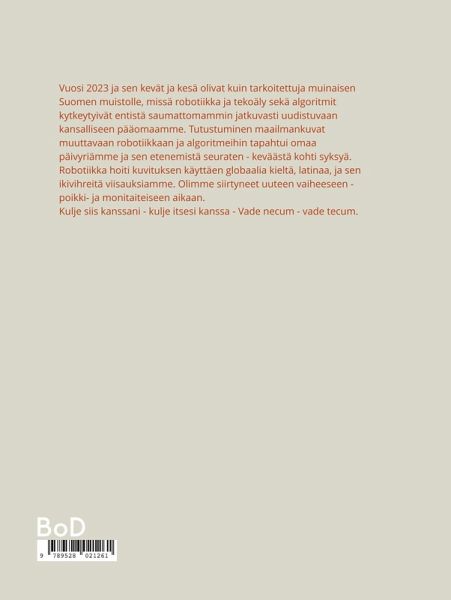 Vuosi 2023 ja sen kevät ja kesä olivat kuin tarkoitettuja muinaisen Suomen muistolle, missä robotiikka ja tekoäly sekä algoritmit kytkeytyivät entistä saumattomammin jatkuvasti uudistuvaan kansalliseen pääomaamme. Tutustuminen maailmankuvat muuttavaan robotiikkaan ja algoritmeihin tapahtui omaa päivyriämme ja sen etenemistä seuraten - keväästä kohti syksyä. Robotiikka hoiti kuvituksen käyttäen globaalia kieltä, latinaa, ja sen ikivihreitä viisauksiamme. Olimme siirtyneet uuteen vaiheeseen - poikki- ja monitaiteiseen aikaan. Kulje siis kanssani - kulje itsesi kanssa - Vade necum - vade tecum.
