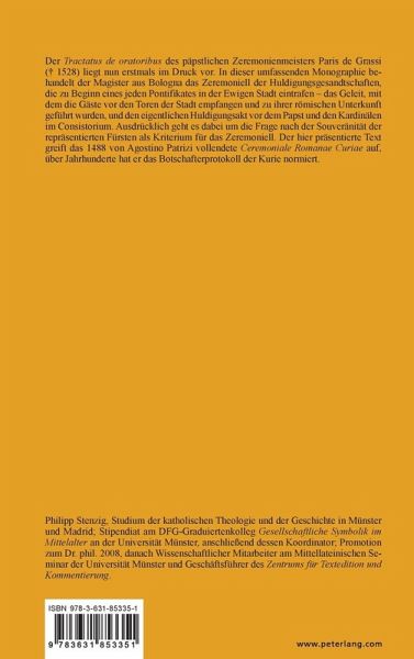 Der Tractatus de oratoribus des päpstlichen Zeremonienmeisters Paris de Grassi ( 1528) liegt nun erstmals im Druck vor. In dieser umfassenden Monographie behandelt der Magister aus Bologna das Zeremoniell der Huldigungsgesandtschaften, die zu Beginn eines jeden Pontifikates in der Ewigen Stadt eintrafen - das Geleit, mit dem die Gäste vor den Toren der Stadt empfangen und zu ihrer römischen Unterkunft geführt wurden, und den eigentlichen Huldigungsakt vor dem Papst und den Kardinälen im Consistorium. Ausdrücklich geht es dabei um die Frage nach der Souveränität der repräsentierten Fürsten als Kriterium für das Zeremoniell. Der hier präsentierte Text greift das 1488 von Agostino Patrizi vollendete Ceremoniale Romanae Curiae auf, über Jahrhunderte hat er das Botschafterprotokoll der Kurie normiert.