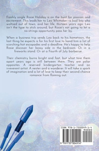 Freshly single Rosie Holiday is on the hunt for passion and excitement. This leads her to Leo Whittaker-a bad boy who waltzed out of town, and her life, thirteen years ago. Leo isn't the type to stick around, but Rosie's not going to let a no-strings opportunity pass her by. When a business trip sends Leo back to his hometown, the last thing he expects is for his first love to hand him a list of scorching-hot escapades and a deadline. He's happy to help Rosie discover her bossy side in the bedroom. Or in a fireworks stand. Or at a Fourth of July barbecue. Their chemistry burns bright and fast, but what tore them apart years ago is still between them. They are polar opposites. A reserved kindergarten teacher and an irreverent artist. A nester and a wanderer. It will take a spark of imagination and a lot of love to keep their second-chance romance from flaming out.