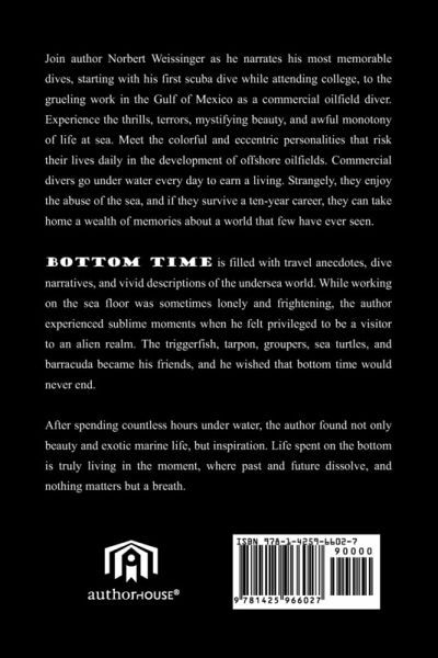 Join author Norbert Weissinger as he narrates his most memorable dives, starting with his first scuba dive while attending college, to the grueling work in the Gulf of Mexico as a commercial oilfield diver. Experience the thrills, terrors, mystifying beauty, and awful monotony of life at sea. Meet the colorful and eccentric personalities that risk their lives daily in the development of offshore oilfields. Commercial divers go under water every day to earn a living. Strangely, they enjoy the abuse of the sea, and if they survive a ten-year career, they can take home a wealth of memories about a world that few have ever seen. Bottom Time is filled with travel anecdotes, dive narratives, and vivid descriptions of the undersea world. While working on the sea floor was sometimes lonely and frightening, the author experienced sublime moments when he felt privileged to be a visitor to an alien realm. The triggerfish, tarpon, groupers, sea turtles, and barracuda became his friends, and he wished that bottom time would never end. After spending countless hours under water, the author found not only beauty and exotic marine life, but inspiration. Life spent on the bottom is truly living in the moment, where past and future dissolve, and nothing matters but a breath.