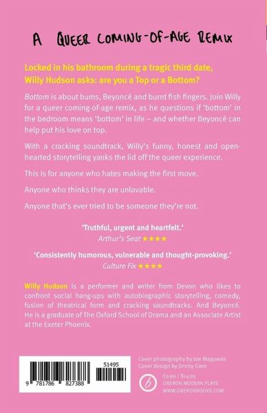A QUEER COMING-OF-AGE REMIX Locked in his bathroom during a tragic third date, Willy Hudson asks: are you a Top or a Bottom? Bottom is about bums, Beyoncé and burnt fish fingers. Join Willy for a queer coming-of-age remix, as he questions if 'bottom' in the bedroom means 'bottom' in life - and whether Beyoncé can help put his love on top. With a cracking soundtrack, Willy's funny, honest and open-hearted storytelling yanks the lid off the queer experience. This is for anyone who hates making the first move. Anyone who thinks they are unlovable. Anyone that's ever tried to be someone they're not.