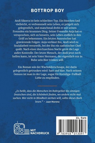 Andi Sikorra ist kein schlechter Typ. Ein bisschen faul vielleicht, er verbummelt sein Leben, er prügelt sich gelegentlich, und manchmal dreht er mit seinen Freunden ein krummes Ding. Seiner Freundin Anja hat er versprochen, sich zu bessern, sein Leben endlich in den Griff zu bekommen. Ein letzter Ausrutscher hat gravierende Folgen: Anja verlässt ihn, Andi wird zu Sozialarbeit verurteilt, bei der ihn ein sadistischer Chef quält. Nach einer durchzechten Nacht gerät die Lage außer Kontrolle. Der letzte Mensch, der Andi jetzt noch helfen kann, ist sein Vater Hermann, der eigentlich nur in Ruhe sein Bier trinken will.Ein Roman wie der Wacholderschnaps, der darin gelegentlich getrunken wird: hart und klar. Nach seinem Genuss ist man in der Lage, sogar für Kreisliga-Fußball Liebe zu empfinden.
