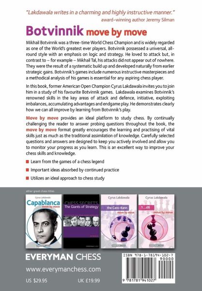 Mikhail Botvinnik was a three-time World Chess Champion and is widely regarded as one of the World's greatest ever players. Botvinnik possessed a universal, all-round style with an emphasis on logic and strategy. He loved to attack but, in contrast to - for example - Mikhail Tal, his attacks did not appear out of nowhere. They were the result of a systematic build up and developed naturally from earlier strategic gains. Botvinnik's games include numerous instructive masterpieces and a methodical analysis of his games is essential for any aspiring chess player. In this book, former American Open Champion Cyrus Lakdawala invites you to join him in a study of his favourite Botvinnik games. Lakdawala examines Botvinnik's renowned skills in the key areas of attack and defence, initiative, exploiting imbalances, accumulating advantages and endgame play. He demonstrates clearly how we can all improve by learning from Botvinnik's play. Move by Move provides an ideal platform to study chess. By continually challenging the reader to answer probing questions throughout the book, the Move by Move format greatly encourages the learning and practising of vital skills just as much as the traditional assimilation of knowledge. Carefully selected questions and answers are designed to keep you actively involved and allow you to monitor your progress as you learn. This is an excellent way to improve your chess skills and knowledge.