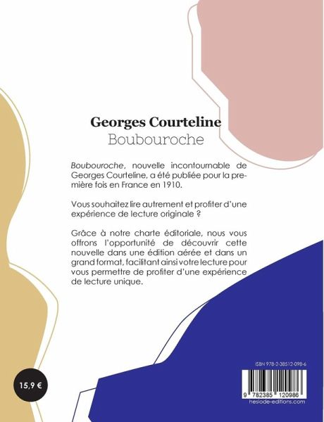 Boubouroche, nouvelle incontournable de Georges Courteline, a été publiée pour la première fois en France en 1910. Vous souhaitez lire autrement et profiter d¿une expérience de lecture originale ? Grâce à notre charte éditoriale, nous vous offrons l¿opportunité de découvrir cette nouvelle dans une édition aérée et dans un grand format, facilitant ainsi votre lecture pour vous permettre de profiter d¿une expérience de lecture unique.