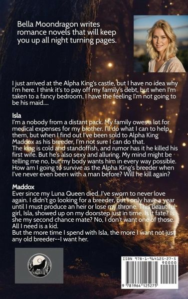 I just arrived at the Alpha King's castle, but I have no idea why I'm here. I think it's to pay off my family's debt, but when I'm taken to a fancy bedroom, I have the feeling I'm not going to be his maid.... Isla I'm a nobody from a distant pack. My family owes a lot for medical expenses for my brother. I'll do what I can to help them, but when I find out I've been sold to Alpha King Maddox as his breeder, I'm not sure I can do that. The king is cold and standoffish, and rumor has it he killed his first wife. But he's also sexy and alluring. My mind might be telling me no, but my body wants him in every way possible. How am I going to survive as the Alpha King's breeder when I've never even been with a man before? Will he kill again? Maddox Ever since my Luna Queen died, I've sworn to never love again. I didn't go looking for a breeder, but I only have a year until I must produce an heir or lose my throne. This beautiful girl, Isla, showed up on my doorstep just in time. Is it fate? Is she my second chance mate? No, I don't want one of those. All I need is a kid. But the more time I spend with Isla, the more I want not just any old breeder--I want her. Over three million reads love this steamy wolf shifter romance!