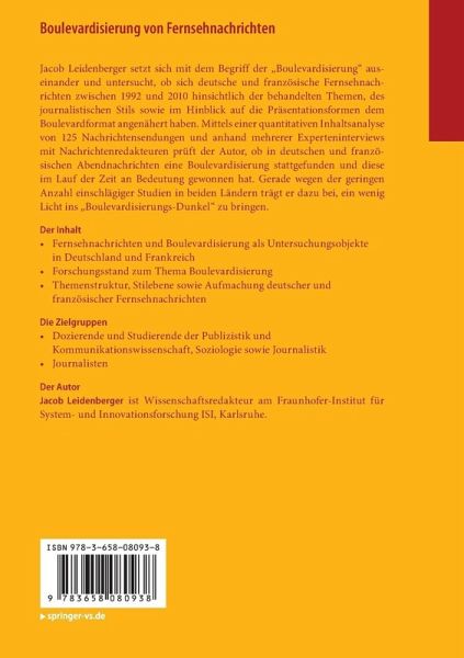 Jacob Leidenberger setzt sich mit dem Begriff der "Boulevardisierung" auseinander und untersucht, ob sich deutsche und französische Fernsehnachrichten zwischen 1992 und 2010 hinsichtlich der behandelten Themen, des journalistischen Stils sowie im Hinblick auf die Präsentationsformen dem Boulevardformat angenähert haben. Mittels einer quantitativen Inhaltsanalyse von 125 Nachrichtensendungen und anhand mehrerer Experteninterviews mit Nachrichtenredakteuren prüft der Autor, ob in deutschen und französischen Abendnachrichten eine Boulevardisierung stattgefunden und diese im Lauf der Zeit an Bedeutung gewonnen hat. Gerade wegen der geringen Anzahl einschlägiger Studien in beiden Ländern trägt er dazu bei, ein wenig Licht ins "Boulevardisierungs-Dunkel" zu bringen.