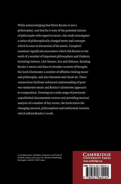 While acknowledging that Pierre Boulez is not a philosopher, and that he is wary of the potential misuse of philosophy with regard to music, this study investigates a series of philosophically charged terms and concepts which he uses in discussion of his music. Campbell examines significant encounters which link Boulez to the work of a number of important philosophers and thinkers, including Adorno, Lévi-Strauss, Eco and Deleuze. Relating Boulez's music and ideas to broader currents of thought, the book illuminates a number of affinities linking music and philosophy, and also literature and visual art. These connections facilitate enhanced understanding of post-war modernist music and Boulez's distinctive approach to composition. Drawing on a wide range of previously unpublished documentary sources and providing musical analysis of a number of key scores, the book traces the changing musical, philosophical and intellectual currents which inform Boulez's work.