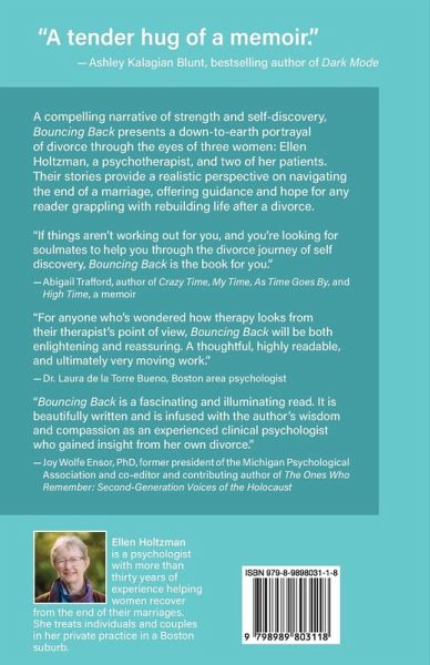 "The book is beautifully written and infused with the author's wisdom and compassion." - Joy Wolfe Ensor, PhD, former president of the Michigan Psychological Association Who better to guide women through the heartbreak of an unhappy marriage than a seasoned psychotherapist who has lived it herself? Decades after her own divorce, Ellen Holtzman reflects on her journey as she helps two of her patients confront the struggles of their faltering relationships. Together, the three women grapple with fear, uncertainty, and a sense of loss. But Holtzman discovers that a marital crisis can lead to self-discovery and new opportunities. Compassionate, insightful, and deeply relatable, Bouncing Back offers hope and inspiration to anyone facing the end of a relationship. The compelling narrative will resonate with readers searching for strength and clarity as they imagine a new future. "If you're looking for a soulmate to help you through the divorce journey, Bouncing Back is the book for you." - Abigail Trafford, author of Crazy Time