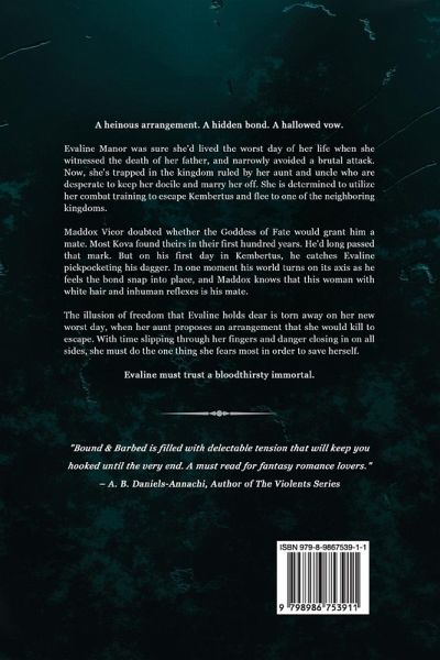 A heinous arrangement. A hidden bond. A hallowed vow. Evaline Manor was sure she'd lived the worst day of her life when she witnessed the death of her father, and narrowly avoided a brutal attack. Now, she's trapped in the kingdom ruled by her aunt and uncle who are desperate to keep her docile and marry her off. She is determined to utilize her combat training to escape Kembertus and flee to one of the neighboring kingdoms. Maddox Vicor doubted whether the Goddess of Fate would grant him a mate. Most Kova found theirs in their first hundred years. He'd long passed that mark. But on his first day in Kembertus, he catches Evaline pickpocketing his dagger. In one moment his world turns on its axis as he feels the bond snap into place, and Maddox knows that this woman with white hair and inhuman reflexes is his mate. The illusion of freedom that Evaline holds dear is torn away on her new worst day, when her aunt proposes an arrangement that she would kill to escape. With time slipping through her fingers and danger closing in on all sides, she must do the one thing she fears most in order to save herself. Evaline must trust a bloodthirsty immortal.