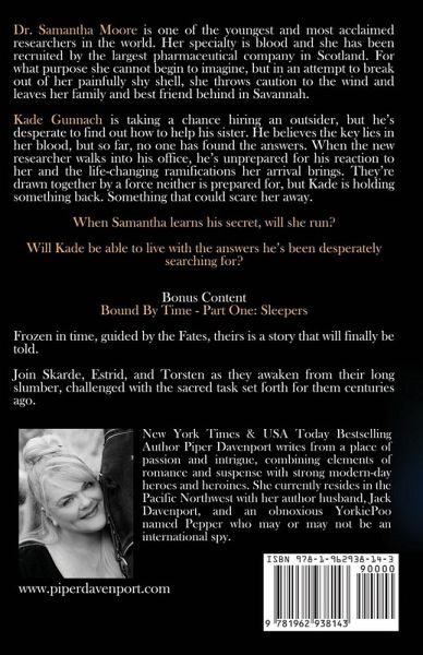 Dr. Samantha Moore is one of the youngest and most acclaimed researchers in the world. Her specialty is blood and she has been recruited by the largest pharmaceutical company in Scotland. For what purpose she cannot begin to imagine, but in an attempt to break out of her painfully shy shell, she throws caution to the wind and leaves her family and best friend behind in Savannah. Dr. Kade Gunnach is taking a chance hiring an outsider, but he's desperate to find out how to help his sister. He believes the key lies in her blood, but so far, no one has found the answers. When the new researcher walks into his office, he's unprepared for his reaction to her and the life-changing ramifications her arrival brings. They're drawn together by a force neither is prepared for, but Kade is holding something back. Something that could scare her away. When Samantha learns his secret, will she run? Will Kade be able to live with the answers he's been desperately searching for? * * * Sleepers Frozen in time, guided by the Fates, theirs is a story that will finally be told. Join Skarde, Estrid, and Torsten as they awaken from their long slumber, challenged with the sacred task set forth for them centuries ago.