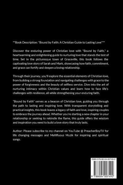 Book Description: "Bound by Faith: A Christian Guide to Lasting Love" Discover the enduring power of Christian love with "Bound by Faith," a heartwarming and enlightening guide to nurturing love that stands the test of time. Set in the picturesque town of Graceville, this book follows the captivating love story of Sarah and Mark, showcasing how faith, commitment, and grace can fortify and deepen a loving relationship. Through their journey, you'll explore the essential elements of Christian love, from building a strong foundation and navigating challenges with grace to the power of forgiveness and the beauty of selfless service. Dive into the art of nurturing intimacy within Christian values and learn how to face life's challenges with resilience, all while strengthening your enduring faith. "Bound by Faith" serves as a beacon of Christian love, guiding you through the path to lasting and inspiring love. With transparent storytelling and practical insights, this book leaves a legacy of faith and love, inspiring couples to embrace the journey ahead. Whether you're starting a new chapter in your relationship or seeking to rekindle the flame, this guide offers the wisdom and inspiration you need to build a love story that truly lasts.