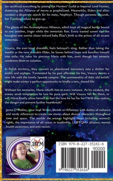 Enjoy this dark epic paranormal romantasy series by sci-fi/fantasy author, Jenna O'Malley where... Fate Could Not be Changed... Ian sacrificed everything by joining the Hunters' Guild as Imperial Lord Hunter, shattering the Alliance of merna as prophesized. Meanwhile, Elders and allies conduct a desperate search for his mate, Nephtyri. Though paranoia abounds, her Turnlings refuse to give up. The ghosts of the Arsinoëphorus Alliance, which kept all magical beings bound to one another, linger while the immortals flee. Every wasted sunset tips the hourglass one sunrise closer toward baby Elias's birth as the prince of all arcane immortals. Vouvry, the ever-loyal dracokin, feels betrayal's sting. Rather than taking the mantle as the new dracokin Elder, he leaves behind hope and banishes himself into exile. He takes his precious Maria with him, even though her amnesia condemns them to isolation. In Polish territory, they convert an abandoned monastery into a shelter for misfits and orphans. Tormented by his past affection for her, Vouvry desires a new life with the lovely Spanish vampire. The commonality of their old beliefs might make winter a perfect opportunity to kindle a new, shared life. Without her memories, Maria rebuffs him at every instance. At his weakest, the enemy sends temptations to lure his pure spirit. Will Vouvry fall for them, or will Maria finally allow herself to feel the love he has for her? Will they realize the danger and prevent further heartbreak? ***** The years bring turmoil as rumors and betrayal coalesce into anarchy, and loyalties among the merna realign. Find out what will happen in The Merna Annals, an epic paranormal fantasy romance series, which contains a diverse host of magical heroes caught in the human world, fighting to save their fates and their loves from a desolate legacy of extinction.