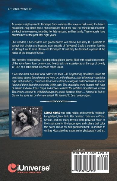 As seventy-eight-year-old Penelope Daos watches the waves crash along the beach beside her Long Island home, she reminisces about her past. Her mind is full of secrets she kept from everyone, including her late husband and her family. These secrets have haunted her for the past fifty-eight years. She wonders if her children and grandchildren will believe her story. Is it possible to accept that pirates and treasure exist outside of fairytales? Could a summer love be so strong it would save Stavro and Penelope? Or will they be destined to perish at the hands of the thieves of Chios? This novel for teens follows Penelope through her journal filled with detailed memories of the adventures, love, demise, and heartbreak she experienced at the age of twenty in 1957 on a little island in Greece called Chios. It was the most beautiful view I had ever seen. The neighboring mountains stood tall and strong across from the one we were on. In the distance, right where one mountains edge met another's, I could see the ocean; a deep blue Aegean dotted with white specks here and there from the menacing white caps. The mountains were layered with rows of mastic and olive trees. Grays and browns colored the petrified mountainous terrain. The breeze seemed to whistle through the space between them ... I turned to look at Stavro; his eyes set on the view ahead. He seemed to be at peace again.