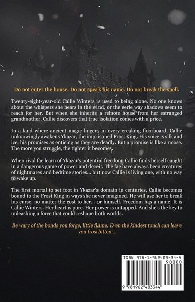 Do not enter the house. Do not speak his name. Do not break the spell. Twenty-eight-year-old Callie Winters is used to being alone. No one knows about the whispers she hears in the wind, or the eerie way shadows seem to reach for her. But when she inherits a remote house from her estranged grandmother, Callie discovers that true isolation comes with a price. In a land where ancient magic lingers in every creaking floorboard, Callie unknowingly awakens Ykazar, the imprisoned Frost King. His voice is silk and ice, his promises as enticing as they are deadly. But a promise is like a noose. The more you struggle, the tighter it becomes. When rival fae learn of Ykazar's potential freedom, Callie finds herself caught in a dangerous game of power and deceit. The fae have always been creatures of nightmares and bedtime stories... but now Callie is living one, with no way to wake up. The first mortal to set foot in Ykazar's domain in centuries, Callie becomes bound to the Frost King in ways she never imagined. He will use her to break his curse, no matter the cost to her... or himself. Freedom has a name. It is Callie Winters. Her heart is pure. Her power is untapped. And she's the key to unleashing a force that could reshape both worlds. Be wary of the bonds you forge, little flame. Even the kindest touch can leave you frostbitten...