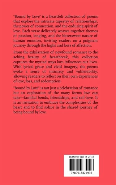 "Bound by Love" is a heartfelt collection of poems that explore the intricate tapestry of relationships, the power of connection, and the enduring spirit of love. Each verse delicately weaves together themes of passion, longing, and the bittersweet nature of human emotion, inviting readers on a poignant journey through the highs and lows of affection. From the exhilaration of newfound romance to the aching beauty of heartbreak, this collection captures the myriad ways love influences our lives. With lyrical grace and vivid imagery, the poems evoke a sense of intimacy and vulnerability, allowing readers to reflect on their own experiences of love, loss, and redemption. "Bound by Love" is not just a celebration of romance but an exploration of the many forms love can take-familial bonds, friendships, and self-love. It is an invitation to embrace the complexities of the heart and to find solace in the shared journey of being bound by love.