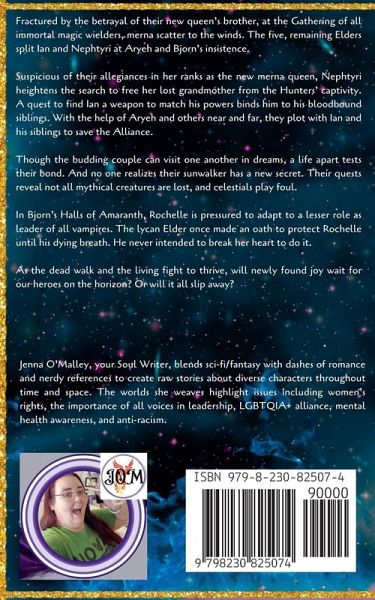 Enjoy this dark epic paranormal romantasy series by sci-fi/fantasy author, Jenna O'Malley where... Everything Comes with a Price... Fractured by the betrayal of their new queen's brother, at the Gathering of all immortal magic wielders, merna scatter to the winds. The five, remaining Elders split Ian and Nephtyri at Aryeh and Bjorn's insistence. Suspicious of their allegiances in her ranks as the new merna queen, Nephtyri heightens the search to free her lost grandmother from the Hunters' captivity. A quest to find Ian a weapon to match his powers binds him to his bloodbound siblings. With the help of Aryeh and others near and far, they plot with Ian and his siblings to save the Alliance. Though the budding couple can visit one another in dreams, a life apart tests their bond. And no one realizes their sunwalker has a new secret. Their quests reveal not all mythical creatures are lost, and celestials play foul. In Bjorn's Halls of Amaranth, Rochelle is pressured to adapt to a lesser role as leader of all vampires. The lycan Elder once made an oath to protect Rochelle until his dying breath. He never intended to break her heart to do it. As the dead walk and the living fight to thrive, will newly found joy wait for our heroes on the horizon? Or will it all slip away? ***** Can immortals save magic, or will humans end them to steal divine power? Find out by continuing The Merna Annals, an epic paranormal fantasy romance series, which contains a diverse host of magical heroes caught in the 17th century human world, fighting to save their fates and their loves from a desolate legacy of extinction.