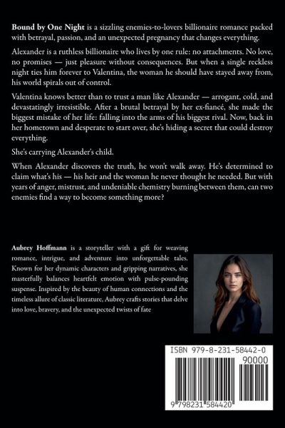 Bound by One Night is a sizzling enemies-to-lovers billionaire romance packed with betrayal, passion, and an unexpected pregnancy that changes everything. Alexander is a ruthless billionaire who lives by one rule: no attachments. No love, no promises - just pleasure without consequences. But when a single reckless night ties him forever to Valentina, the woman he should have stayed away from, his world spirals out of control. Valentina knows better than to trust a man like Alexander - arrogant, cold, and devastatingly irresistible. After a brutal betrayal by her ex-fiancé, she made the biggest mistake of her life: falling into the arms of his biggest rival. Now, back in her hometown and desperate to start over, she's hiding a secret that could destroy everything. She's carrying Alexander's child. When Alexander discovers the truth, he won't walk away. He's determined to claim what's his - his heir and the woman he never thought he needed. But with years of anger, mistrust, and undeniable chemistry burning between them, can two enemies find a way to become something more?