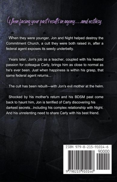 When facing your past results in agony...and ecstasy. When they were younger, Jon and Night helped destroy the Commitment Church, a cult they were both raised in, after a federal agent exposes its seedy underbelly. Years later, Jon's job as a teacher, coupled with his heated passion for colleague Carly, brings him as close to normal as he's ever been. Just when happiness is within his grasp, that same federal agent returns... The cult has been rebuilt-with Jon's evil mother at the helm. Shocked by his mother's return and his BDSM past come back to haunt him, Jon is terrified of Carly discovering his darkest secrets...including his complex relationship with Night. And his unrelenting need to share Carly with his best friend.