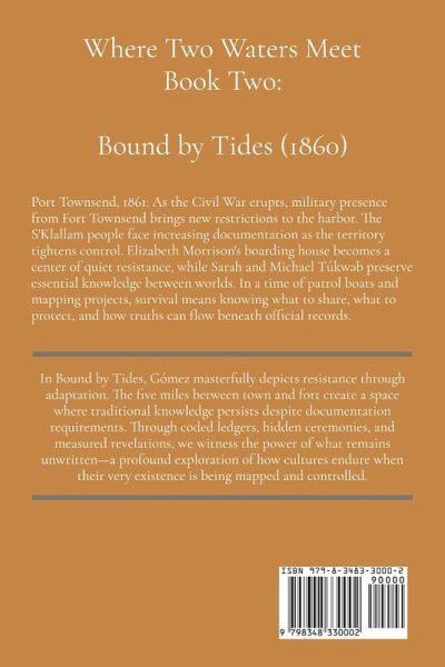Bound by Tides - A Historical Novel of Port Townsend (Book Two) Where Two Waters Meet: The Port Townsend Saga A DECADE HAS PASSED, AND PORT TOWNSEND IS NO LONGER A FLEDGLING SETTLEMENT. In 1860, as the Civil War casts its long shadow across America, Port Townsend finds itself transformed. What was once a delicate balance between settlers and S'Klallam people is now increasingly dictated by military oversight, official records, and the tightening grip of federal control. Elizabeth Morrison has built a prosperous boarding house where ship captains, territorial judges, and now Union officers take their meals and find their beds. But beneath her careful ledgers lies a deeper accounting-of bonds maintained, traditions preserved, and resistance hidden in plain sight. As Fort Townsend's soldiers establish their presence five miles from town, the S'Klallam face impossible choices. Young Michael Túkwəb and Sarah Morrison come of age learning to navigate between worlds-finding paths through waters that have been marked with new boundaries but still run with ancient currents. Chief Chetzemoka leads his people through this changing landscape, adapting ceremonies to survive scrutiny while preserving their essential meaning. In shipyards and Custom Houses, on ceremony beaches and Victorian porches, the characters find ways to maintain what matters most when everything seems to be slipping away. Bound by Tides continues the sweeping saga of Port Townsend's early days, revealing how power and resistance operate in the spaces between official records-and how some things cannot be erased, no matter how the tide turns.