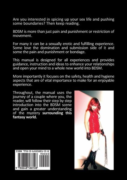 Caution: contains sexual references and images! Interested in spicing up your sex life while pushing some boundaries? Then keep on reading. BDSM is more than just pain and punishment or restriction of movement. It can be a sexually erotic and fulfilling experience. Some love the domination and submission side of it, and some the pain and punishment or bondage. This manual is designed for all levels of experience, providing guidance, instruction, and ideas to enhance your relationships and open your mind to a whole new and exciting world of BDSM. More importantly, it focuses on the safety, health, and hygiene aspects that are of vital importance to both partners having an enjoyable experience. Throughout this manual you will follow the journey of a couple and their step by step introduction into the BDSM scene and gain a greater understanding of the mystery surrounding this stimulating and provocative fantasy world.
