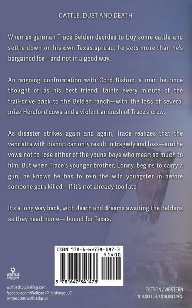 CATTLE, DUST AND DEATH. When ex-gunman Trace Belden decides to buy some cattle and settle down on his own Texas spread, he gets more than he’s bargained for—and not in a good way. An ongoing confrontation with Cord Bishop, a man he once thought of as his best friend, taints every minute of the trail-drive back to the Belden ranch—with the loss of several prize Hereford cows and a violent ambush of Trace’s crew. As disaster strikes again and again, Trace realizes that the vendetta with Bishop can only result in tragedy and loss—and he vows not to lose either of the young boys who mean so much to him. But when Trace’s younger brother, Lonny, begins to carry a gun, he knows he has to rein the wild youngster in before someone gets killed—if it’s not already too late. It’s a long way back, with death and dreams awaiting the Beldens as they head home— bound for Texas.