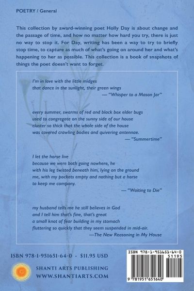 This collection by award-winning poet Holly Day is about change and the unrelenting passage of time, and how no matter how hard you try, there is just no way to stop it. For Day, writing has been a way to try to briefly stop time, to capture as much of what's going on around her and what's happening to her as possible. This collection of eighty poems is a book of snapshots, literary images of things the poet doesn't want to forget, such as "Hospice," "Dinner with the English Professor," "Sunshine," and "Parakeet."