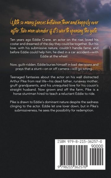 Can a stunt double catch a falling star and not get burned? As a young rising star, Eddie Crane fell in love with costar Cory, but a car accident—with Eddie at the wheel—ripped Cory out of his life. Now, scarred and guilt-ridden, Eddie tempts fate that a stunt—on or off camera—will go wrong. Teenaged fantasies about the actor on his wall distracted Arthur Pike from the real-life unrequited love for his best friend and from his dysfunctional family. Now grown and off the farm, Pike is a horse stuntman hired to teach a reluctant Eddie to ride. Pike is drawn to Eddie's dominant nature despite the sadness clinging to the actor. Eddie let one lover down, but in Pike's submissiveness, he sees the possibility for redemption.
