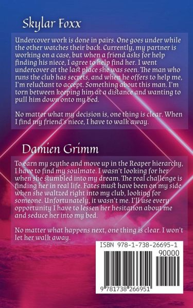 Skylar Foxx Undercover work is done in pairs. One goes under while the other watches their back. Currently, my partner is working on a case, but when a friend asks for help finding his niece, I agree to help find her. I went undercover at the last place she was seen. The man who runs the club has secrets, and when he offers to help me, I'm reluctant to accept. Something about this man. I'm torn between keeping him at a distance and wanting to pull him down onto my bed. No matter what my decision is, one thing is clear. When I find my friend's niece, I have to walk away. Damien Grimm To earn my scythe and move up in the Reaper hierarchy, I have to find my soulmate. I wasn't looking for her when she stumbled into my dream. The real challenge is finding her in real life. Fates must have been on my side when she waltzed right into my club, looking for someone. Unfortunately, it wasn't me. I'll use every opportunity I have to lessen her hesitation about me and seduce her into my bed. No matter what happens next, one thing is clear. I won't let her walk away.