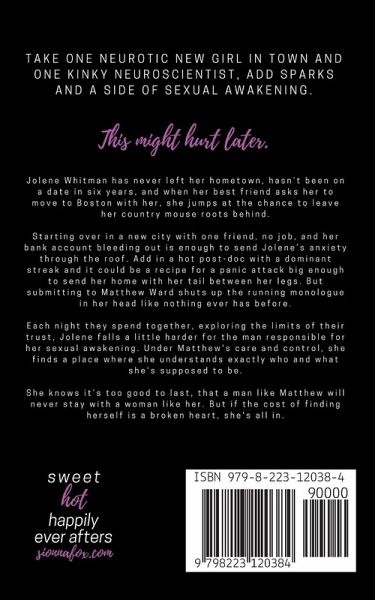 Take one neurotic new girl in town and one kinky neuroscientist, add sparks and a side of sexual awakening. This might hurt later. Jolene Whitman has never left her hometown, hasn't been on a date in six years, and when her best friend asks her to move to Boston with her, she jumps at the chance to leave her country mouse roots behind. Starting over in a new city with one friend, no job, and her bank account bleeding out is enough to send Jolene's anxiety through the roof. Add in a hot post-doc with a dominant streak and it could be a recipe for a panic attack big enough to send her home with her tail between her legs. But submitting to Matthew Ward shuts up the running monologue in her head like nothing ever has before. Each night they spend together, exploring the limits of their trust, Jolene falls a little harder for the man responsible for her sexual awakening. Under Matthew's care and control, she finds a place where she understands exactly who and what she's supposed to be. She knows it's too good to last, that a man like Matthew will never stay with a woman like her. But if the cost of finding herself is a broken heart, she's all in.