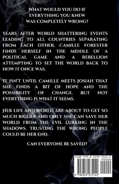 Years after world shattering events leading to all countries separating from each other, Camille Forester finds herself in the middle of a political game and a rebellion attempting to set the world back to how it once was. It isn't until Camille meets Josiah that she finds a bit of hope and the possibility of change. But not everything is what it seems. Her life and world are about to get so much bigger and only she can save her world from the evil lurking in the shadows. Trusting the wrong people could be her end.