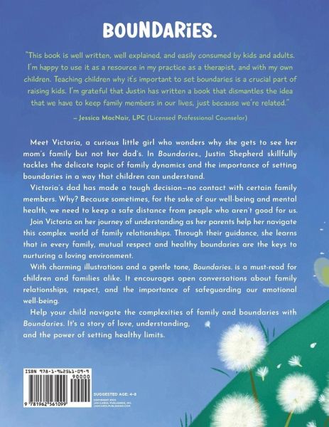 Help your child navigate the complexities of family and boundaries with Boundaries. It's a story of love, understanding, and the power of setting healthy limits. Meet Victoria, a curious little girl who wonders why she gets to see her mom's family but not her dad's. In Boundaries., Author Justin Shepherd skillfully tackles the delicate topic of family dynamics and the importance of setting boundaries in a way that children can understand. Victoria's dad has made a tough decision-no contact with certain family members. Why? Because sometimes, for the sake of our well-being and mental health, we need to keep a safe distance from people who aren't good for us. Join Victoria on her journey of understanding as her parents help her navigate this complex world of family relationships. Through their guidance, she learns that in every family, mutual respect and healthy boundaries are the keys to nurturing a loving environment. With charming illustrations and a gentle tone, Boundaries. is a must-read for children and families alike. It encourages open conversations about family relationships, respect, and the importance of safeguarding our emotional well-being.