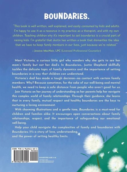 Help your child navigate the complexities of family and boundaries with Boundaries. It's a story of love, understanding, and the power of setting healthy limits. Meet Victoria, a curious little girl who wonders why she gets to see her mom's family but not her dad's. In Boundaries., Justin Shepherd skillfully tackles the delicate topic of family dynamics and the importance of setting boundaries in a way that children can understand. Victoria's dad has made a tough decision-no contact with certain family members. Why? Because sometimes, for the sake of our well-being and mental health, we need to keep a safe distance from people who aren't good for us. Join Victoria on her journey of understanding as her parents help her navigate this complex world of family relationships. Through their guidance, she learns that in every family, mutual respect and healthy boundaries are the keys to nurturing a loving environment. With charming illustrations and a gentle tone, Boundaries. is a must-read for children and families alike. It encourages open conversations about family relationships, respect, and the importance of safeguarding our emotional well-being.