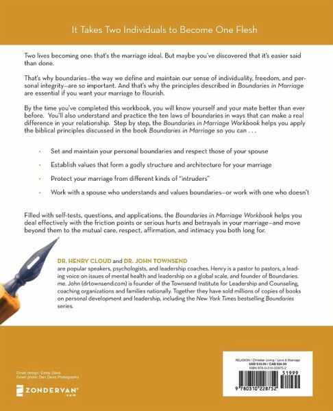 You long for a marriage marked by lifelong love, intimacy, and growth. And it can be yours -- if you set wise boundaries. Boundaries are the 'property lines' that define and protect each of you as individuals. Get them in place and you can make a good marriage better and possibly even save a less-than-satisfying one. By the time you've completed this workbook, you will know yourself and your mate better than ever before. You'll also understand and practice the ten laws of boundaries in ways that can make a real difference in your relationship. Step by step, the Boundaries in Marriage Workbook helps you apply the biblical principles discussed in the book Boundaries in Marriage so you can . . . Set and maintain your personal boundaries and respect those of your spouse - Establish values that form a godly structure and architecture for your marriage - Protect your marriage from different kinds of 'intruders' - Work with a spouse who understands and values boundaries -- or work with one who doesn't -- Filled with self-tests, questions, and applications, the Boundaries in Marriage Workbook helps you deal effectively with the friction points and serious hurts in your marriage -- and move beyond them to the mutual care, respect, affirmation, and intimacy you both long for.