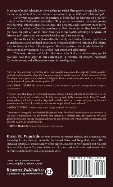 In an age of moral relativity, is there a place for rules? They govern acceptable behavior on the sports field, but do they have a position in general life and relationships? 3,500 years ago, a new nation emerged as Moses led the Israelites on a journey toward the land God had promised them. They needed boundaries that would govern their worship, interpersonal relationships, and property, and God wrote them down. We refer to them as the Ten Commandments. Over the centuries, they have formed the basis for rule of law in most countries of the world, defining boundaries of fairness and interaction, within which we live and have our being. But are they still relevant in and for the twenty-first century? Some regard them as anachronistic and outdated, superseded by more enlightened thinking. For others, they are timeless. Clearly, Jesus regarded them as pertinent for all who follow him, although in many instances he clarified their intent and application. This book takes a fresh look at the boundaries God gave his emerging special race and how they apply in our current age--a resource for pastors, individual Christ-followers, and a discussion-starter for small groups.