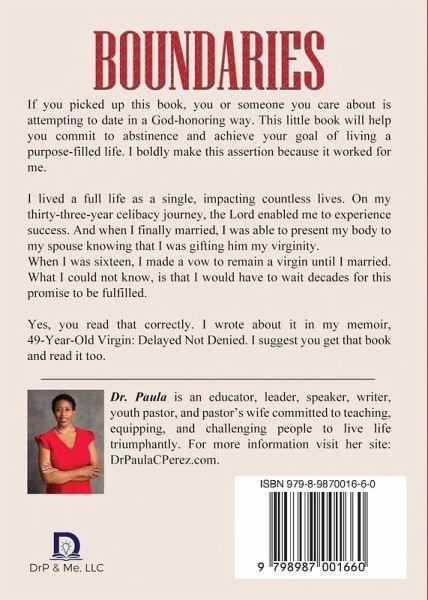 BOUNDARIES: Saving Yourself Until Marriage is a powerful book for use by parents, teens and singles that encourages Christ-centered dating. This relationship study guide provides dating tips for remaining celibate and a frank discussion on the taboo topics in religious circles of masturbation and pornography. Individuals may use the book. However, reading this book in small groups will provide the added benefit of discussion and accountability. The tips in this book are from a Biblical perspective. The author breaks down the acronym BOUNDARIES using a study guide format. In addition, she addresses singles choosing abstinence after having sex (whether the sex was by choice or force). She reminds the reader that it's never too late to choose the path of celibacy. The author's discussion of pornography and masturbation provides food for thought and a warning of how these areas can work against the goal of saving yourself until marriage. Dr. Perez is qualified to address this topic because she lived it. When she was sixteen, she made a vow not to have sex until she married. She had to wait decades for this promise to be fulfilled. However, throughout her journey she remained celibate. You can read about it in her memoir, 49-Year-Old Virgin: Delayed Not Denied. Praise for BOUNDARIES: Saving Yourself Until Marriage "A great book especially for young women and those women who are recommitting themselves to God." ~ Alicia Renee "Very informative. . . I want my children to read it." Adrienne Jenkins