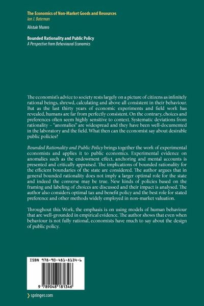 "Alistair Munro's book ... provides an important contribution to this emerging literature. The author has a broad scope and examines several implications of bounded rationality that are of interest for public economics. ... several implications of bounded rationality that are relevant for environmental economists are addressed, mainly for non-market valuation research. ... The material is accessible for researchers or graduate students who want to be introduced to the topic, while several chapters tackle more advanced issues that can be of interest for an expert audience." (W. J. W. Botzen, Environmental and Resource Economics, Vol. 49, 2011)