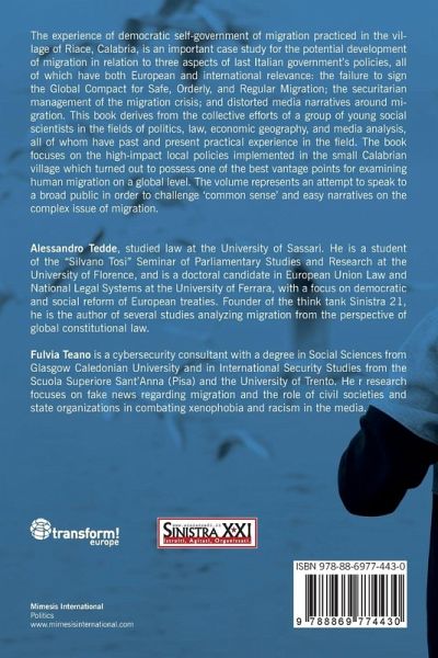 The experience of democratic self-government of migration practiced in the village of Riace, Calabria, is an important case study for the potential development of migration in relation to three aspects of last Italian government's policies, all of which have both European and international relevance: the failure to sign the Global Compact for Safe, Orderly, and Regular Migration; the securitarian management of the migration crisis; and distorted media narratives around migration. This book derives from the collective efforts of a group of young social scientists in the fields of politics, law, economic geography, and media analysis, all of whom have past and present practical experience in the field. The book focuses on the high-impact local policies implemented in the small Calabrian village which turned out to possess one of the best vantage points for examining human migration on a global level. The volume represents an attempt to speak to a broad public in order to challenge 'common sense' and easy narratives on the complex issue of migration.