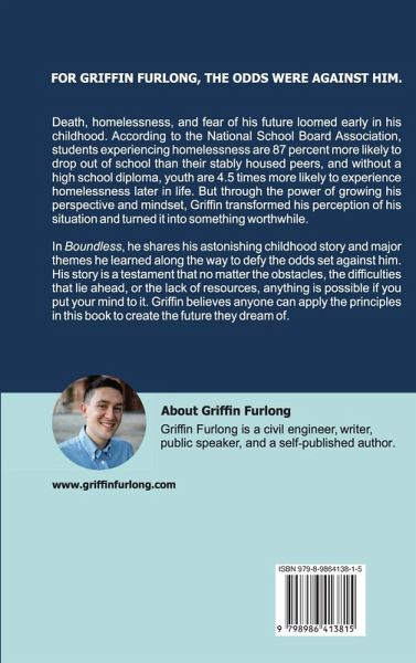 For Griffin Furlong, the odds were against him. Death, homelessness, and fear of his future loomed early in his childhood. According to the National School Board Association, students experiencing homelessness are 87 percent more likely to drop out of school than their stably housed peers, and without a high school diploma, youth are 4.5 times more likely to experience homelessness later in life. But through the power of growing his perspective and mindset, Griffin transformed his perception of his situation and turned it into something worthwhile. In Boundless, he shares his astonishing childhood story and major themes he learned along the way to defy the odds set against him. His story is a testament that no matter the obstacles, no matter the difficulties that lie ahead, and no matter the lack of resources, anything is possible if you put your mind to it. Griffin believes anyone can apply the principles in this book to create the future they dream of.