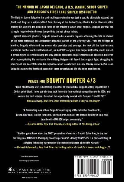 The memoir of Jason Delgado, a US Marine scout sniper and MARSOC's first lead sniper instructor. The fight for Jason Delgado's life and soul began when he was just a boy. He ultimately escaped the death and drugs of a crime-riddled Bronx by way of the United States Marine Corps. However, after earning his way into the esteemed ranks of the service's famed Scout Snipers, Delgado saw that old struggle reignited when he was dumped into the hell of war in Iraq. There Delgado proved not only a participant, but a warrior capable of turning the tide in several of the most harrowing and historically important battles of the evolving war. He took all the hard lessons learned in combat and, as MARSOC's original lead sniper instructor, made himself a pivotal figure in revolutionizing the way special operations snipers trained and operated. But even after accomplishing his mission in the military, Delgado still faced that original fight, struggling to understand and accept the man his experiences had transformed him into. Bounty Hunter 4/3 is Jason Delgado's captivating first-hand account of these powerful and life-changing experiences.